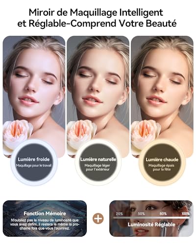Profitez d'un miroir lumineux avec fonction de mémoire de luminosité. Réglez la luminosité en appuyant longuement sur l'interrupteur et ajustez la tonalité de couleur entre la lumière froide, chaude et naturelle selon vos préférences. Équipé d'un câble de chargement Type-C et d'une batterie de 2000 mAh, il vous garantit un éclairage optimal où que vous soyez. -